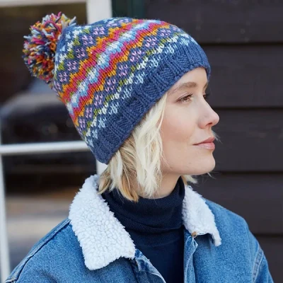 Pachamama Women Wool Beanie Bobble Hat Fleece Lined Handknitted Fairisle Diamond Denim Multicoloured One Size Handmade Extra Warm Fair Trade