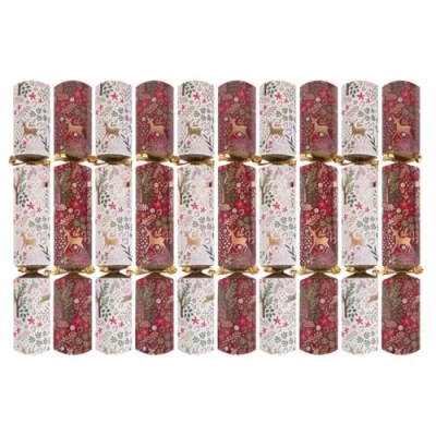Bring a touch of woodland charm to your festive table with this box of 10 Harvey & Mason crackers, each featuring elegant reindeer and seasonal foliage in red and cream tones. Each cracker measures approximately 14 inches and is finished with gold curling ribbon, adding a stylish and traditional look to your Christmas dinner setting. Inside each cracker, guests will find a classic paper hat, a seasonal motto, a snap, and a thoughtfully chosen plastic-free gift suitable for all ages. Perfect for formal dinners or casual family gatherings, these crackers offer a fun and festive way to entertain guests and create lasting holiday memories. Made with sustainability in mind, both the crackers and packaging are fully recyclable, and all contents are plastic-free, offering an eco-friendly festive option.