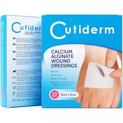 Cutiderm Low Adherent Calcium Alginate Wound Dressings 5cm x 5cm - Pack of 10 Sterile, Soft and Flexible. Highly absorbent. Helps to maintain a moist wound healing environment Suitable for cuts and lacerations, post surgical wounds, exuding wounds including venous, arterial and diabetic ulcers Change the dressing daily or as required. Use a bandage or secondary dressing to secure in place CE certified product