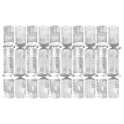 Pack of 10 White Silver Seasons Greetings Family Christmas Crackers 12" Metallic Festive Xmas Holiday Dinner Table Decorations Novelty Fun Prizes Gifts Contains Hats Jokes