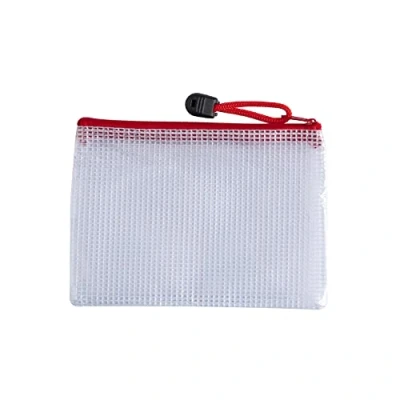 Pack of 12 A6 Red PVC Mesh Zip bags. Made from durable PVC with white mesh. Mesh bags ideal for documents, stationery and other items. Durability allows it to be used many times. Ideal for home, school and office use. Coloured zipper with hang rope for easy open and closure. Size: 165x120mm. Thickness 250microns. Available in a range of colours and sizes from the Janrax range.