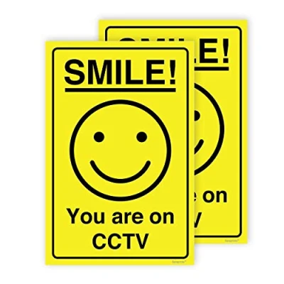 Pack includes: 2 x Smile your on camera signs outdoor stickers of size 150 x 100 mm. Material: our camera stickers are printed on self-adhesive waterproof material. Usage: these cctv sign are suitable for use in offices, restaurants, homes, supermarkets, parking areas, farmland, warehouses, construction sites, and other monitored locations to indicate camera surveillance. Easy to apply: the cctv stickers are easy to peel from the backing paper and apply to clean, smooth surfaces such as windows, doors, and glass areas. Origin: Manufactured and dispatched from the UK.