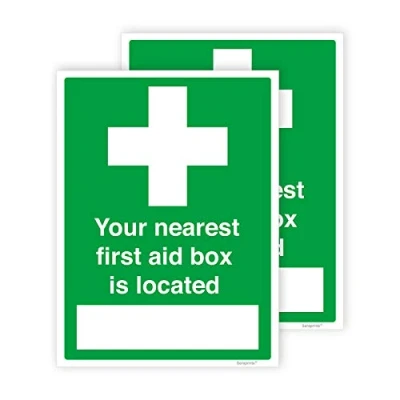 Pack includes: 2 x first aid signage stickers of size 150 x 200 mm. Material: our first aid kit vinyl stickers are printed on self-adhesive waterproof material. Usage: our first aid signs help indicate where first aid supplies are stored, supporting compliance with workplace health and safety guidelines. suitable for offices, hospitals, warehouses, and other facilities. Easy to apply: our first aid stickers are easy to peel from the backing paper and apply to any smooth, clean surface. Origin: Manufactured and dispatched from the UK.