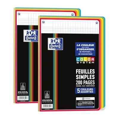 Pack of 2 single sheet 200 pages - Optik Paper quality, a unique extra white satin paper that does not bleed through for unbeatable writing comfort Assortment of 5 different coloured frames per pack: blue, green, yellow, orange and red Binding large Seyès squares, in 2 colours, for better visibility. The sheets are perforated with 4 pencil cases. They can be stored quickly and easily in a binder Rounded corners so pages don't get tangled, 200 pages Optik Paper quality, a unique extra white satin paper that won't bleed through for unbeatable writing comfort