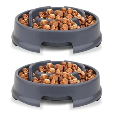 { Pack of 2 Slow Feeder Bowls }: Includes two slow feeder dog bowls designed to help your pet eat at a healthier pace, preventing gulping and overeating. { Anti-Skid Design }: Equipped with three anti-skid rubber pads beneath each bowl to prevent sliding and overturning, minimizing food spillage onto the ground. Features slightly curved handles for easy lifting and placement of the bowls. { Enhances Mealtime Fun }: Unique patterned obstacles in the bowl make meals fun and engaging for your pet, promoting better nutrient absorption. The maze design encourages your dog to chew and savor their food, reducing the risk of obesity and digestive issues. { Safe and Durable Materials }: Made from environmentally friendly, pet-safe materials that are high temperature resistant, strong, and bite-resistant for long-lasting use. Ideal for both dogs and cats, helping them form healthy eating habits and enjoy their meals more. 【ONE SIZE FITS ALLl】: The diameter of slow feeder bowl is 8.5 inch/21.5cm, 2 inch/5cm height and 230g. It has a capacity of about 34 OZ/1000ml. These dog food bowls are more suitable for medium and large dogs.