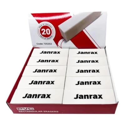 Pack of 20 PVC Rectangular Erasers by Janrax. These quality erasers are made from durable PVC material, ensuring that they are long-lasting and reliable. Each eraser measures approximately 60x10x21mm, making them the ideal size for comfortably holding in your hand while erasing. The white colour of the erasers allows for easy visibility and precise erasing, whether you're working on a school project, a professional presentation, or simply jotting down some notes. The erasers come packaged in a convenient and compact box of 20s, making them easy to store and transport. Whether you're an artist, student, or professional, our pack of PVC erasers is the perfect choice for your erasing needs.