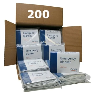 200 EVAQ8 Adult-Size Individually Sealed Foil Blankets Use to Retain Body Heat in Emergencies & for Sports Events Reflects over 90% of Body Heat Even When User is Wet Compact packing easy to store. Large when open: each 130cm x 210cm First Aid - Hypothermia - Shock - Sports - Rescue - Survival