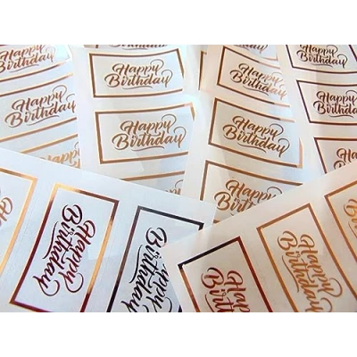 Pack of 24 Happy Birthday Stickers Rose Gold Copper Foil on Clear Transparent Sticky Labels for Cards, Craft and Decoration
