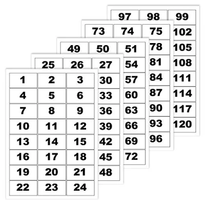 Pack contains: Consecutive Number Stickers (1 to 120) of size 63 x 34 mm. Self-adhesive sequential numbers rectangle white labels with black numbers. You will receive white background with bold black font only (black border in product image is for illustration purposes). Material: Large number stickers are printed on durable paper material. Usage: Numbered stickers can be used on storage boxes, desks, files, batteries, memory cards, plastic bobbins, DMC threads, packaging, and more. Easy peel: Sticker numbers are easy to peel off and apply on flat, dry surfaces. Origin: Manufactured and dispatched from the UK with papa prints.