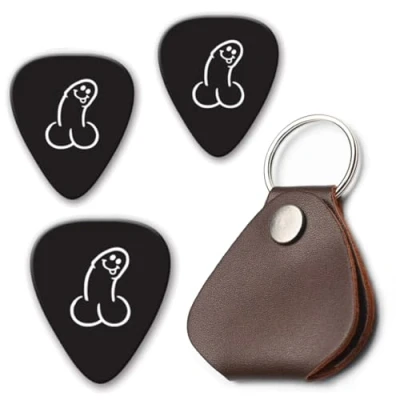 Pack of 3 x DickPicks in Leather Pick Holder Keyring ! Choose between Floppy (0.71mm), Semi (0.96mm) or Stiffy (1.35mm). A mix of the 3 or even the luminous glow in the dark Semi ! Celluloid Hight Quality Electric & Acoustic Guitar Pick Plectrums ! Reliable and Long Lasting - Never be without a Dick Pick with the Genuine Leather Plectrum Holder Keychain Unleash your inner musical mischief with this one-of-a-kind plectrum that's sure to hit all the right notes.