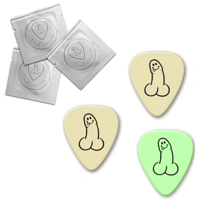 Pack of 3 x DickPicks ~ Perfect for strumming up some laughs and musical mischief! Glow in the Dark for those who like it with the lights off! Always be prepared for an impromptu performance. Because we believe in safe shredding! Whether you're a seasoned musician or just looking to add some humor to your strumming, DickPicks are the perfect accessory for every guitarist with a sense of humor. Safe, reliable and long lasting ! Individually packaged in condom foils So grab your guitar and get ready to rock out with your... pick out!