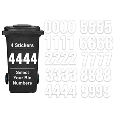Product Specification: Pack of 4 White Bin Numbers for Wheelie Bins Number 4 of size 17 cm. Our Wheelie Bin Self-Adhesive stickers are printed on high quality environmentally friendly material, which is waterproof, and durable. Idle for Wheelie Bins, Garbage Bins, Can be used to stick on Doors, Windows, Lockers storage containers etc. Premium Quality: With our Simple and Elegant looking bin stickers, make your bin stand out from the rest. Avoid getting it mixed up with other dirty bins. Easy Peel & stick on Clean and Dry Surface, Made in the UK