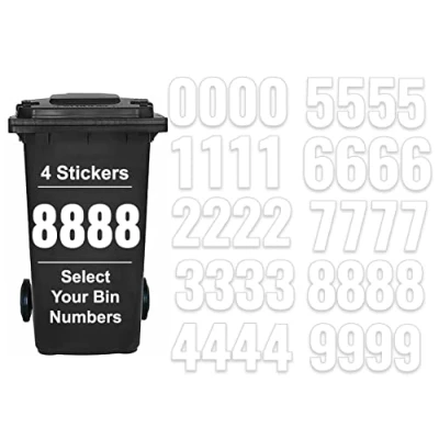 Product Specification: Pack of 4 White Bin Numbers for Wheelie Bins Number 8 of size 17 cm. Our Wheelie Bin Self-Adhesive stickers are printed on high quality environmentally friendly material, which is waterproof, and durable. Idle for Wheelie Bins, Garbage Bins, Can be used to stick on Doors, Windows, Lockers storage containers etc. Premium Quality: With our Simple and Elegant looking bin stickers, make your bin stand out from the rest. Avoid getting it mixed up with other dirty bins. Easy Peel & stick on Clean and Dry Surface, Made in the UK
