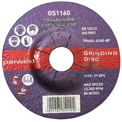 100 x 6.0 x 16mm ( 4" x 15/64" x 5/8") Parweld Grinding Discs Trade quality depressed centre grinding discs ideal for welding seams. Manufactured to: EN12413, ISO9001. CE Approved. Grade: A24R-BF