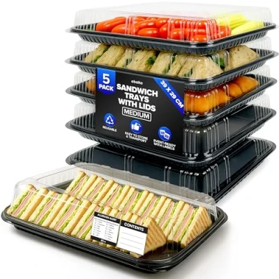 REUSABLE - Our Sandwich Trays and Lids are made out of recycled plastic and can be hand washed with warm soap and water! Using dish soap and a sponge you can wash and leave to dry to use again. ALLERGY STICKERS INCLUDED - Our Buffet Trays with Lids set comes with customizable stickers to write the "contents" and "allergies" of the food you put in the trays. The trays come with tight fitted clear lids to seal your food and showcase what is in the trays! CATERING TRAYS - Events, parties, banquets, weddings, birthdays, catering and home cooking, these buffet trays can be used at all events or any occasions. You can use them for sandwiches, sushi or bagels for picnics, putting it into the fridge or using them for a buffet. AVAILABLE IN VARIOUS SIZES & PACKS – Select the perfect size and quantity for your needs. Choose from tray sizes of 34 × 24 × 7.5 cm, 39 × 29 × 7.5 cm, or 45 × 31 × 7.5 cm, with multiple pack options ideal for everything from intimate gatherings to large-scale events. WARRANTY - If you do have an issue with the product, message us (the seller) directly for a 6 month warranty on this product.