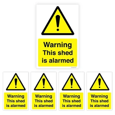 Warning This shed is alarmed Signs - 100mmx150mm. Material: High Gloss Permanent 5 Year Premium Self Adhesive. Self adhesive Adheres securely to any dry surface. Simply, peel and stick the sticker onto a clean, smooth surface. Just peel the sticker from the backing paper and apply it on a dry surface. Self Adhesive Waterproof Durable Vinyl Sticker.
