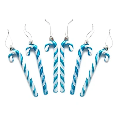 6pc Christmas candy canes hanging ornaments with striped patterns Each Candy Cane measures approximately 13cm and comes with a gold top with gold string loop attached Material: Made from high quality durable plastic Colour: Turquoise These festive candy cane decorations are sure to brighten up your Christmas tree this Christmas!! And they can be used again and again!!! Available in 13 vibrant and rich colours and glittery