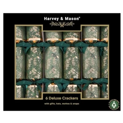 This deluxe box of six Christmas crackers features a traditional green foliage design printed on a light and dark green base, enhanced with shiny gold hotstamp and finished with elegant green satin ribbon for a refined festive display. Each cracker measures 13.5 inches and contains all the classic Christmas elements, including a snap, colourful party hat, cheerful motto, and a surprise gift to delight guests. Gift contents include a fun and varied selection such as a bracelet, Sudoku puzzle, marbles, bottle opener, dice, or key ring—perfect for adding excitement to your celebration. These crackers offer a beautiful way to enhance your Christmas table setting, combining timeless design and festive entertainment suitable for all ages and gatherings. Designed with sustainability in mind, the crackers and their packaging are fully recyclable, allowing you to enjoy festive traditions while making an eco-friendly choice.