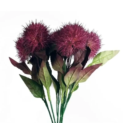 ManoManoGeneral description Pack of 6 x 70cm Globe Thistle Purple Ball Artificial Flower stems. These artificial globe thistle stems can be used to create beautiful arrangements with other artificial flowers or as standalone decorations. Technical specifications Overall height: 70cm Width: 15cm Material: Plastic flowers and silk leaves Usage These stems are easy to cut down to a shorter length using a pair of wire cutters if required. Some photos may show vases to illustrate size and arrangement possibilities, but no vases or planters are included with the flowers.