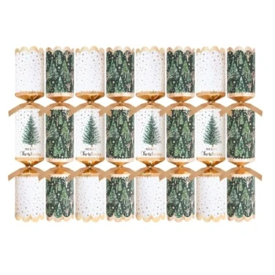Pack of 8 Premium Green White Gold Tree Christmas Crackers 12.5" Metallic Festive Xmas Holiday Dinner Table Decorations Novelty Fun Prizes Gifts Contains Hats Jokes