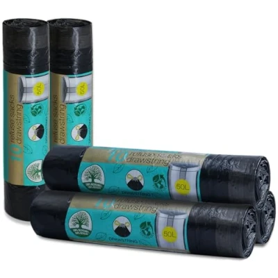 Pack of Fifty 50L Refuse Sacks Recyclable, Drawstring Black Rubbish Bags, Made From 100% Recycled Materials