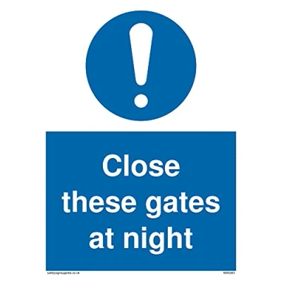 M001 : General mandatory action This sign is made from vinyl high tack A stickier sticker. Uses a stronger adhesive to make it more suitable for plastic surfaces like Wheelie Bins or where the sticker might get rubbed. A5 portrait Sign Text: Close these gates at night