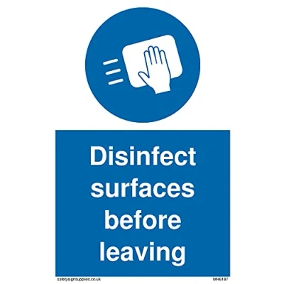 No Symbol This sign is made from vinyl / sticker ‘Air Release†vinyl makes it easy to stick to flat, clean surfaces without bubbles. Not for rough, plastic or dusty surfaces. A6 portrait Sign Text: Disinfect surfaces before leaving