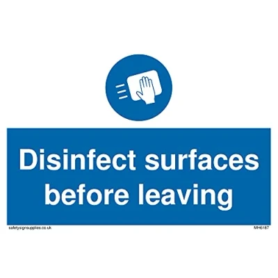 No Symbol This sign is made from vinyl / sticker ‘Air Release†vinyl makes it easy to stick to flat, clean surfaces without bubbles. Not for rough, plastic or dusty surfaces. A6 landscape Sign Text: Disinfect surfaces before leaving