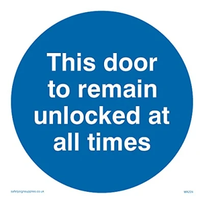 No Symbol This sign is made from vinyl / sticker ‘Air Release†vinyl makes it easy to stick to flat, clean surfaces without bubbles. Not for rough, plastic or dusty surfaces. S10 square Sign Text: Door To Remain Unlocked All Times