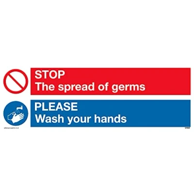 No Symbol This sign is made from vinyl / sticker ‘Air Release†vinyl makes it easy to stick to flat, clean surfaces without bubbles. Not for rough, plastic or dusty surfaces. 15 landscape Sign Text: dual standard red prohibtion symbol & wash hands symbol in blue circle