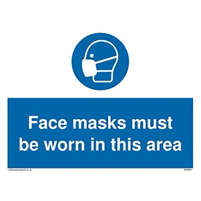 M016 : Wear a mask This sign is made from vinyl high tack A stickier sticker. Uses a stronger adhesive to make it more suitable for plastic surfaces like Wheelie Bins or where the sticker might get rubbed. A5 landscape Sign Text: Face masks must be worn in this area