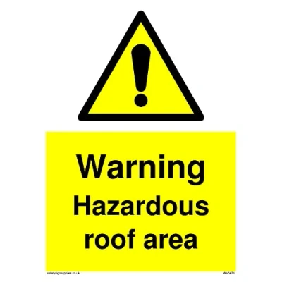 No Symbol This sign is made from vinyl / sticker ‘Air Release†vinyl makes it easy to stick to flat, clean surfaces without bubbles. Not for rough, plastic or dusty surfaces. A5 portrait Sign Text: Hazardous roof area with general warning symbol