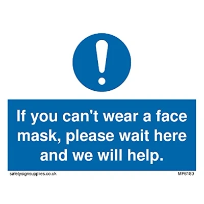 No Symbol This sign is made from vinyl / sticker ‘Air Release†vinyl makes it easy to stick to flat, clean surfaces without bubbles. Not for rough, plastic or dusty surfaces. A7 landscape Sign Text: If you can't wear a face mask please wait here and we will help.