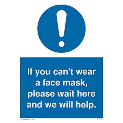 M001 : General mandatory action This sign is made from vinyl high tack A stickier sticker. Uses a stronger adhesive to make it more suitable for plastic surfaces like Wheelie Bins or where the sticker might get rubbed. A5 portrait Sign Text: If you can't wear a face mask please wait here and we will help.