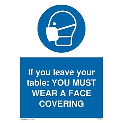 No Symbol This sign is made from vinyl / sticker ‘Air Release†vinyl makes it easy to stick to flat, clean surfaces without bubbles. Not for rough, plastic or dusty surfaces. A5 portrait Sign Text: If you leave your table: YOU MUST WEAR A FACE COVERING
