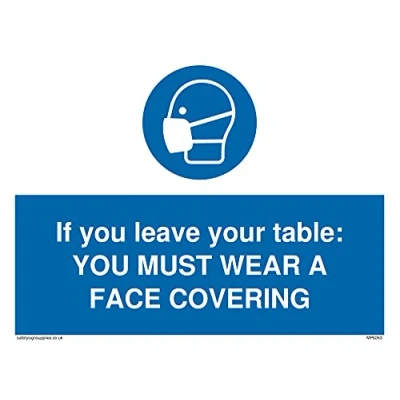 No Symbol This sign is made from vinyl / sticker ‘Air Release†vinyl makes it easy to stick to flat, clean surfaces without bubbles. Not for rough, plastic or dusty surfaces. A5 landscape Sign Text: If you leave your table: YOU MUST WEAR A FACE COVERING
