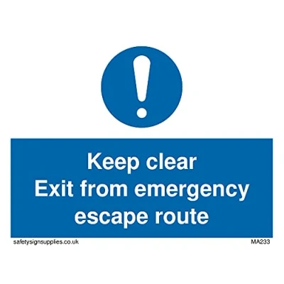 No Symbol This sign is made from vinyl / sticker ‘Air Release†vinyl makes it easy to stick to flat, clean surfaces without bubbles. Not for rough, plastic or dusty surfaces. A7 landscape Sign Text: keep clear exit from emergency escape route