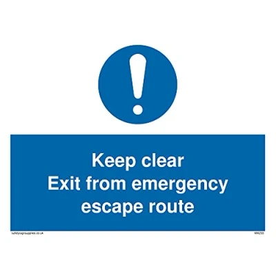 M001 : General mandatory action This sign is made from vinyl high tack A stickier sticker. Uses a stronger adhesive to make it more suitable for plastic surfaces like Wheelie Bins or where the sticker might get rubbed. A5 landscape Sign Text: keep clear exit from emergency escape route