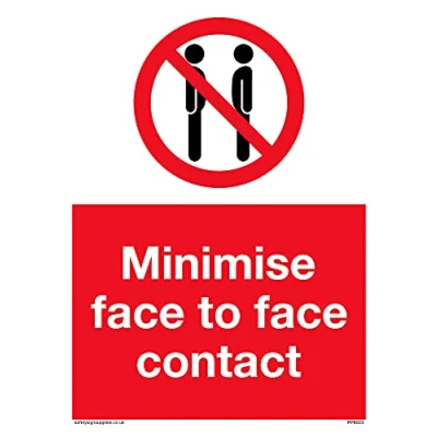 No Symbol This sign is made from vinyl / sticker ‘Air Release†vinyl makes it easy to stick to flat, clean surfaces without bubbles. Not for rough, plastic or dusty surfaces. A5 portrait Sign Text: Minimise face to face contact with prohibiton symbol
