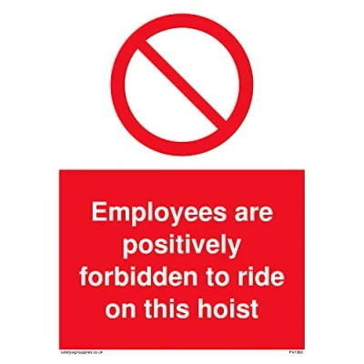 No Symbol This sign is made from vinyl / sticker ‘Air Release†vinyl makes it easy to stick to flat, clean surfaces without bubbles. Not for rough, plastic or dusty surfaces. A5 portrait Sign Text: No Riding On Hoist