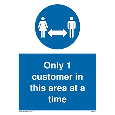 M916 : Keep distance This sign is made from vinyl high tack A stickier sticker. Uses a stronger adhesive to make it more suitable for plastic surfaces like Wheelie Bins or where the sticker might get rubbed. A5 portrait Sign Text: Only 1 customer in this area at a time