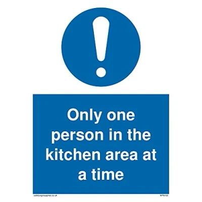 No Symbol This sign is made from vinyl / sticker ‘Air Release†vinyl makes it easy to stick to flat, clean surfaces without bubbles. Not for rough, plastic or dusty surfaces. A5 portrait Sign Text: Only one person in the kitchen area at a time