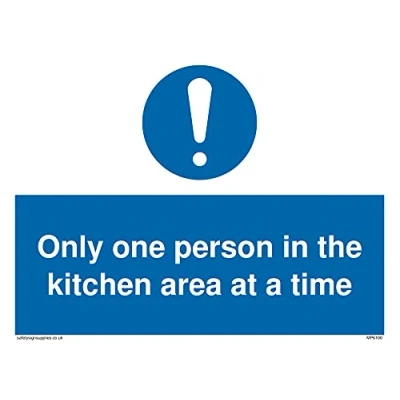 M001 : General mandatory action This sign is made from vinyl high tack A stickier sticker. Uses a stronger adhesive to make it more suitable for plastic surfaces like Wheelie Bins or where the sticker might get rubbed. A5 landscape Sign Text: Only one person in the kitchen area at a time