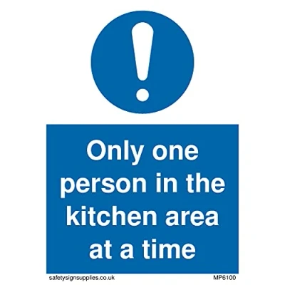 No Symbol This sign is made from vinyl / sticker ‘Air Release†vinyl makes it easy to stick to flat, clean surfaces without bubbles. Not for rough, plastic or dusty surfaces. A7 portrait Sign Text: Only one person in the kitchen area at a time