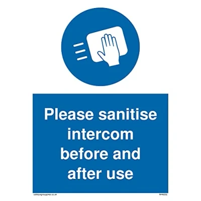 No Symbol This sign is made from vinyl / sticker ‘Air Release†vinyl makes it easy to stick to flat, clean surfaces without bubbles. Not for rough, plastic or dusty surfaces. A5 portrait Sign Text: Please sanitise intercom before and after use