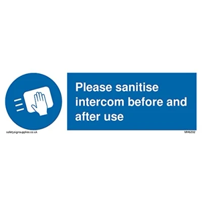 No Symbol This sign is made from vinyl / sticker ‘Air Release†vinyl makes it easy to stick to flat, clean surfaces without bubbles. Not for rough, plastic or dusty surfaces. 15 landscape Sign Text: Please sanitise intercom before and after use