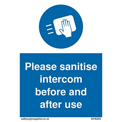 No Symbol This sign is made from vinyl / sticker ‘Air Release†vinyl makes it easy to stick to flat, clean surfaces without bubbles. Not for rough, plastic or dusty surfaces. A7 portrait Sign Text: Please sanitise intercom before and after use