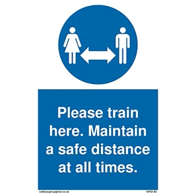 No Symbol This sign is made from vinyl / sticker ‘Air Release†vinyl makes it easy to stick to flat, clean surfaces without bubbles. Not for rough, plastic or dusty surfaces. A6 portrait Sign Text: Please train here. Maintain a safe distance at all times.