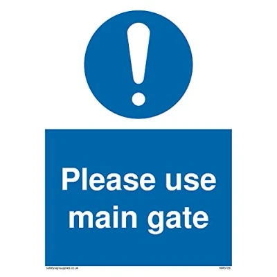 M001 : General mandatory action This sign is made from vinyl high tack A stickier sticker. Uses a stronger adhesive to make it more suitable for plastic surfaces like Wheelie Bins or where the sticker might get rubbed. A5 portrait Sign Text: Please use main gate