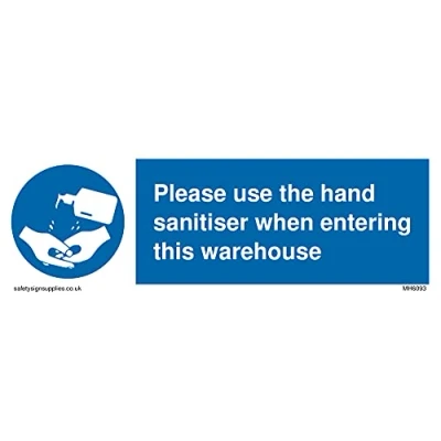 No Symbol This sign is made from vinyl / sticker ‘Air Release†vinyl makes it easy to stick to flat, clean surfaces without bubbles. Not for rough, plastic or dusty surfaces. 15 landscape Sign Text: Please use the hand sanitiser when entering this warehouse
